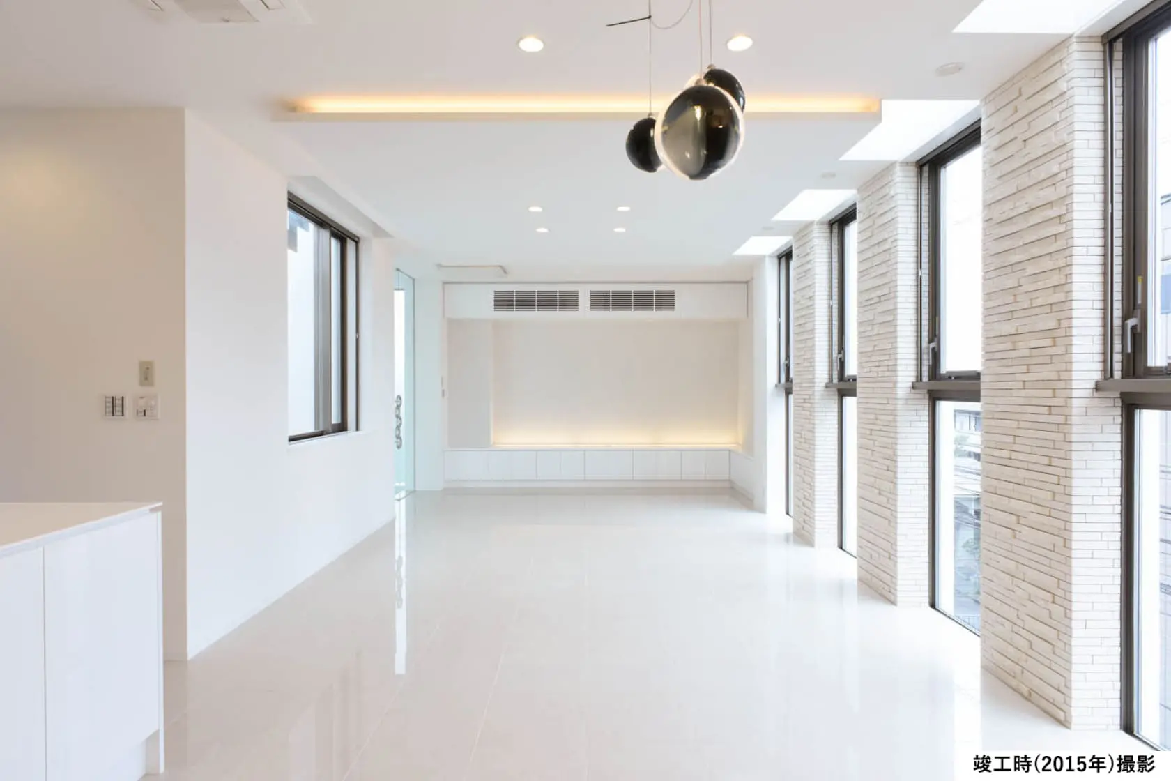 【LDK】白を基調としたLDKは明るく清らかな雰囲気。連続したスリット開口が自然光を均等に導き、室内全体へ心地よい明るさを届けます。
