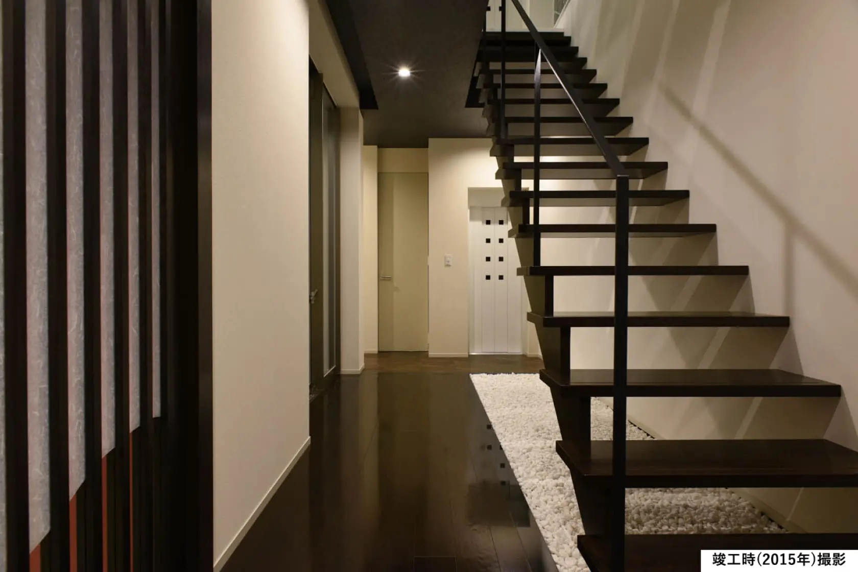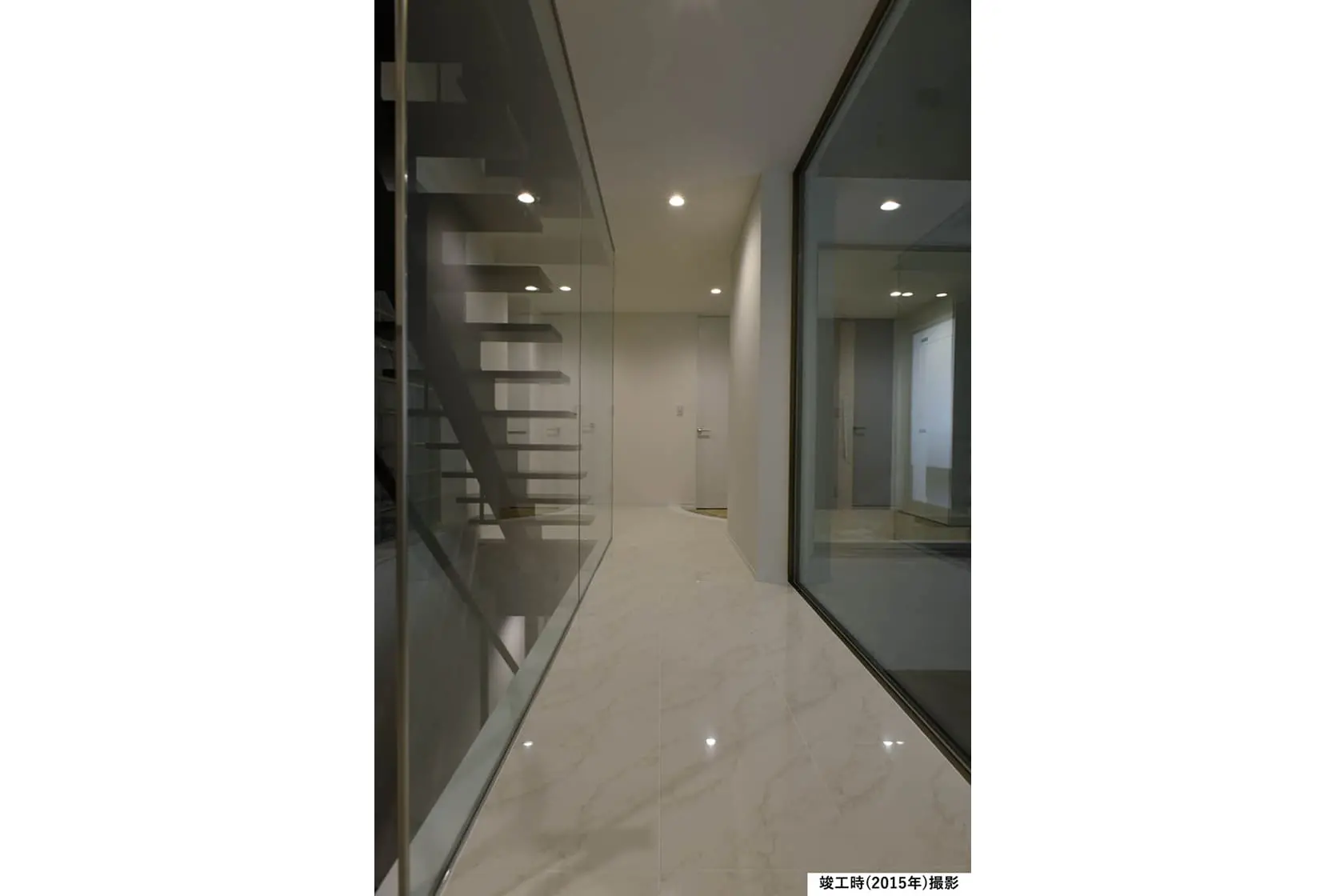 【1階ホール】スリット階段とガラスの間仕切りによって視線が抜け、閉塞感を感じさせないホールに。床に使用した大理石調タイルが空間に上質さを添えています。