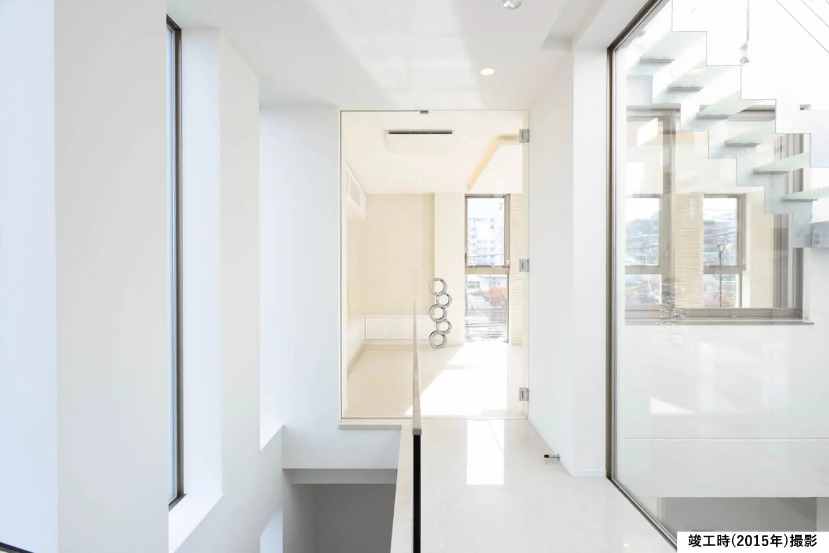 【3階ホール】光と視線が通り抜ける、明るさと透明感に包まれたホール。渡り廊下を抜けてLDKへとたどり着く動線は、日常を特別なひとときに演出します。