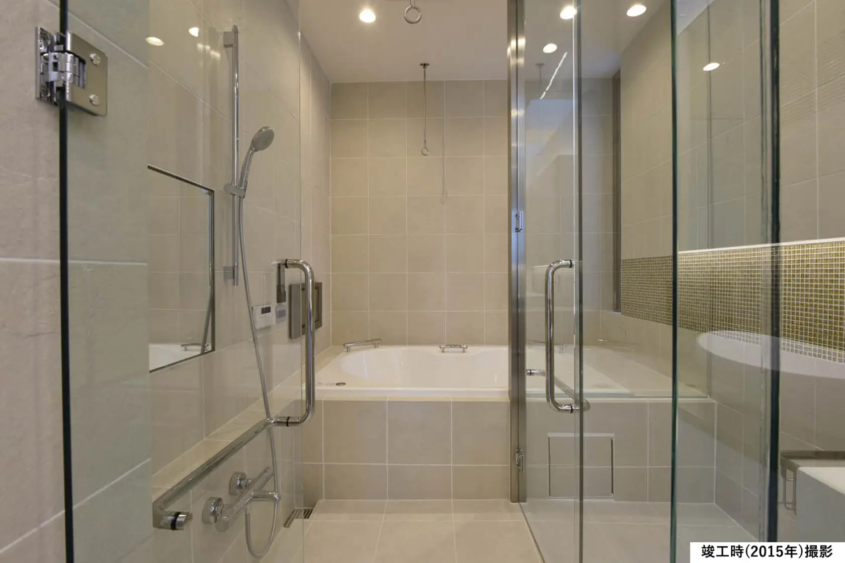 【バスルーム】ベージュのタイルとガラスモザイクが織りなす上質なバスルーム。2つのへッドレストを備え、家族でゆったりと過ごせるホテルライクな空間です。